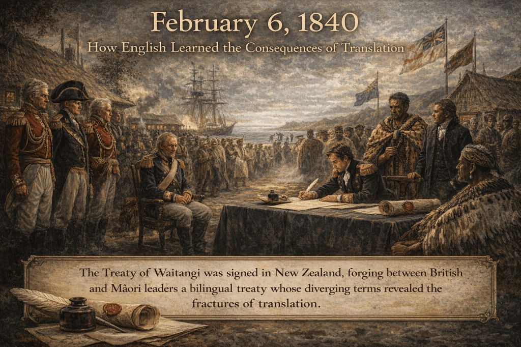 On February 6, 1840, the Treaty of Waitangi was signed in New Zealand between representatives of the British Crown and Māori chiefs. While primarily a political and legal event, the treaty has had a profound and lasting impact on the history of the English language as a legal, colonial, and interpretive instrument. Few documents have more clearly demonstrated how English meaning can shift—and fracture—when law, translation, and power intersect.