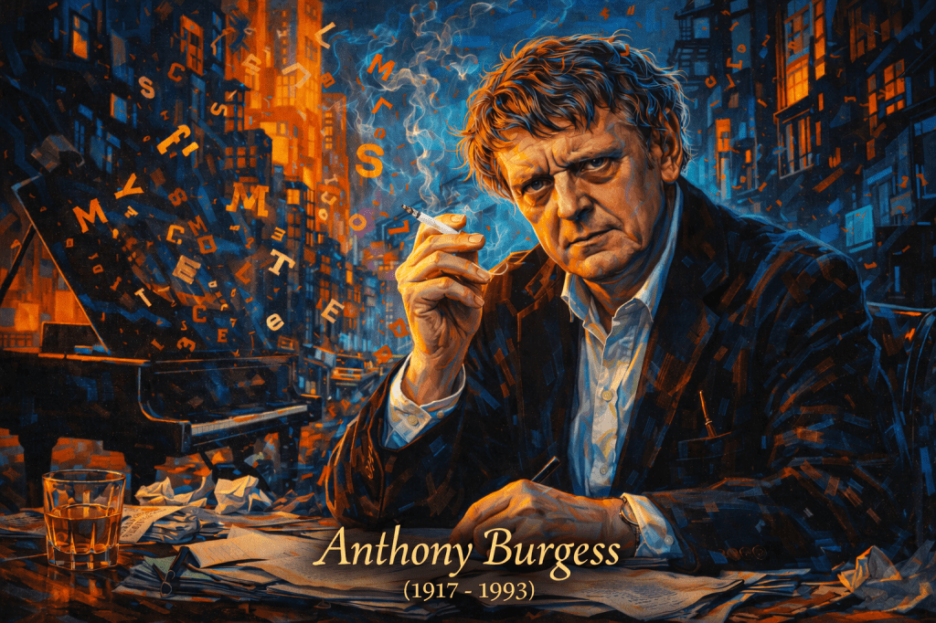 On February 25, 1917, in Manchester, Anthony Burgess was born—one of the most linguistically daring novelists of the twentieth century. Best known for A Clockwork Orange, Burgess treated English not as a fixed medium but as a system open to distortion, hybridization, and reinvention. His work demonstrated that modern fiction could experiment radically with vocabulary, syntax, and voice without losing narrative force.